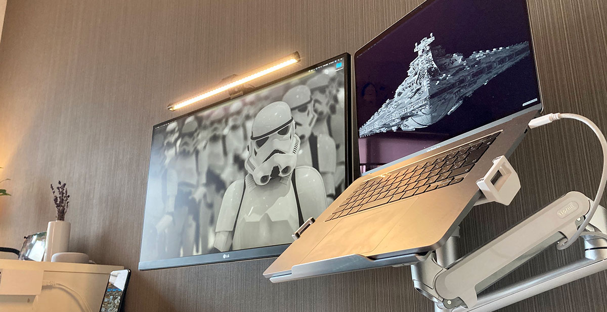 実を言うとわたくし、ここ10年くらいずっとiMac 27inch Mid 2010をメインの制作環境として使っておりました。ガンダムで言えば「よくもあんな老朽艦が浮いていられるものだな」とか言われそうな旧型機という事になります。とはいえメモリ増設とSSD換装によりそこそこ現役として使えてはいたので、毎年のように新型が出るのを横目で見ながらスルーしておりました。しかしながら最近のAdobe CCのアップデートを経て「さすがにそろそろ限界か・・・」と感じる機会が増えましてですね、いよいよ10年ぶりにメイン機体を買い換えようと思ったのであります。けれど今はIntelチップからAppleSiliconへの移行期、このタイミングでIntel Macを買うというのも納得がいかない。けれど本命のiMacのフルモデルチェンジ&AppleSilicon版の発表はまだかなり先になりそう。というわけで様々なジレンマの中、手近にあるMacBook Pro 16inchをメイン機とし、AppleSilicon版 iMacが出るまでのつなぎとしてのシステムを組む事にしました。買ったのは27inch 4KモニターとVESAアームです。